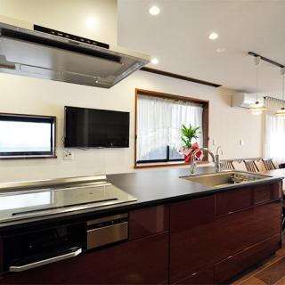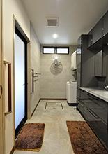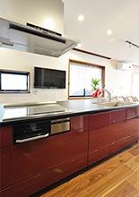 車椅子や介護が必要になった場合に備えて、トイレや洗面室はスペースをできるだけ拡張し、手すりも設置。お母様が暮らしやすいことはもちろんですが、ラグジュアリーさも重視。壁一面をエコカラットにして重厚感を出したり、ワインレッドが印象的なアイランドキッチンを採用したりと、見た目もスタイリッシュで洗練されたゆとりある空間に生まれ変わっています。