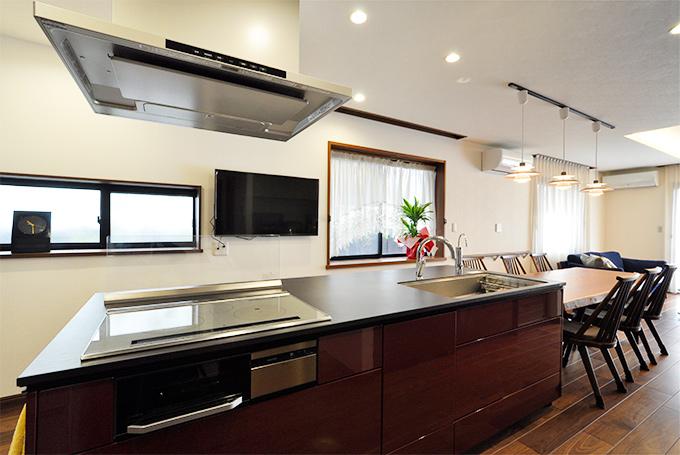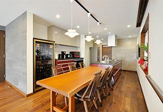無垢の一枚板で横幅が2300あるダイニングテーブルをキッチン横にどーんと配置。離れて暮らす息子さんのご家族が遊びにきても、みんな揃ってお食事が楽しめます。