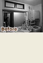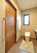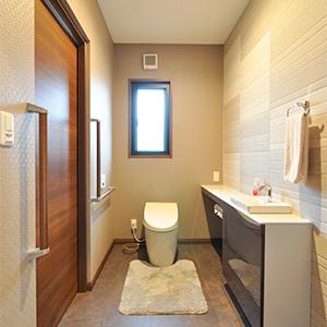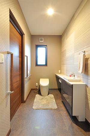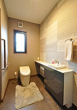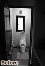別々だったトイレと手洗いをひとつにしてスペースを拡張。車椅子で利用したり、介護を必要とする場合にも便利に使えます。取り替えたばかりでまだ新しい便器はそのまま活かし、収納付の手洗い器(TOTO/レストルームドレッサー)を設置。壁一面にエコカラットを貼っているので消臭効果は抜群です。