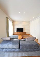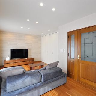 玄関へとつながる扉は高さのある親子ドアにして、車椅子でも通りやすい広さを確保。壁面はダーク色のエコカラット(LIXIL)をアクセントで貼り、重厚感のあるリビングに。折り上げ天井は建築化照明で調色・調光ができるので、シーンに合わせて雰囲気を変えることができます。