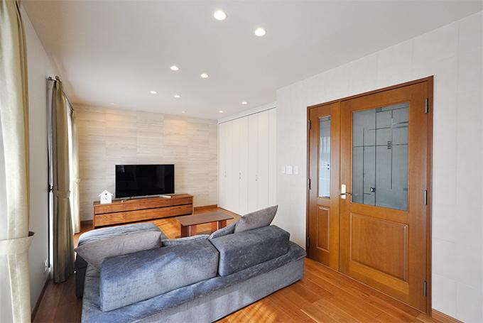使用しなくなった2階の子供部屋をセカンドリビングに。入口の扉は1階のリビングで使用していたものを再利用。天井までの高さある収納も完備。書斎横の扉から寝室へと続きます。