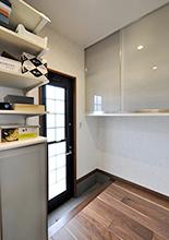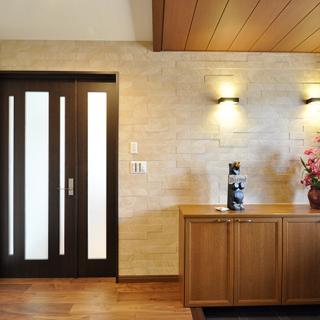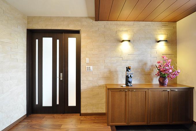 玄関にも装飾だけでなく、消臭や調湿の機能を持ったエコカラット(LIXIL)を貼りアクセントウォールに。リビングとはまた違うエコカラットですが、重厚感・高級感のあるエントランスに仕上がっています。