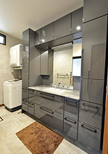 収納が少なく使い勝手の悪かった洗面室は、一部の収納スペースを取り込みTOTO/エスクアシリーズ(収納300+洗面化粧台1300+収納300)が設置できる広さを確保。