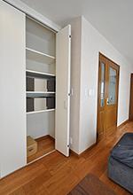 キッチン奥は勝手口へとつながるパントリー。食品ストックやたくさんの食器類が収納できるので、LDKはいつでもスッキリを保てます。