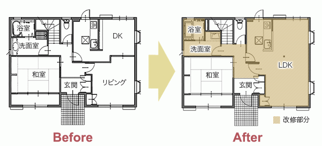| リフォーム箇所 | キッチン、ダイニング、リビング、浴室、洗面室 |