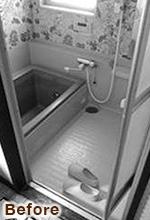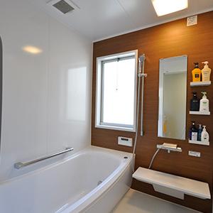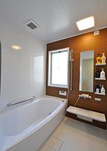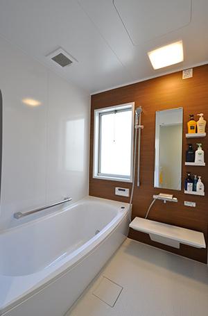 在来工法の浴室からユニットバス(TOTO/サザナ「1616サイズ、HSシリーズ」)に取り替え。お手入れが簡単で、明るく落ち着いた清潔感のある雰囲気に生まれ変わっています。
