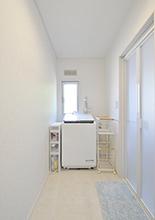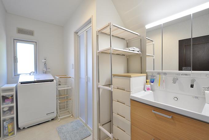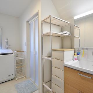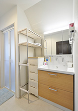 以前洗濯機があった場所に洗面台を移動。化粧台はTOTO/サクア(W750×H1800)。洗面台の上は階段のため勾配天井になっています。白を基調に明るくナチュラルな洗面室に。