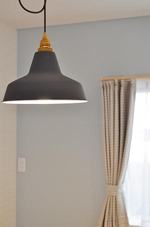 奥様のコーティネートでダイニングセット、ペンダントライト、時計など配置。白をベースに木目の温もりとネイビーを差し色とした統一感のある空間です。