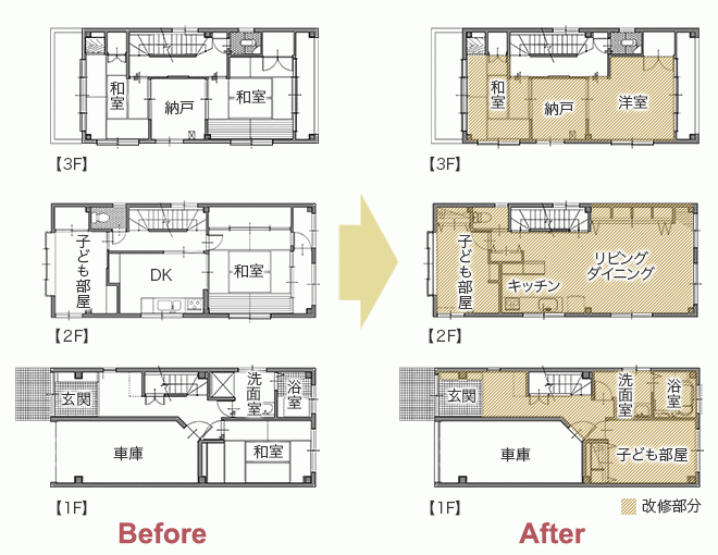 | リフォーム箇所 | 1F(浴室、洗面室、子ども部屋、玄関)、2F(リビング、ダイニング、キッチン、子ども部屋)、3F(洋室、和室、納戸)、外壁塗装、屋外防水 |