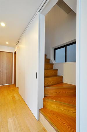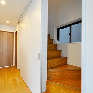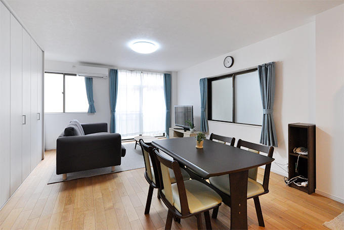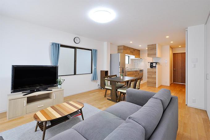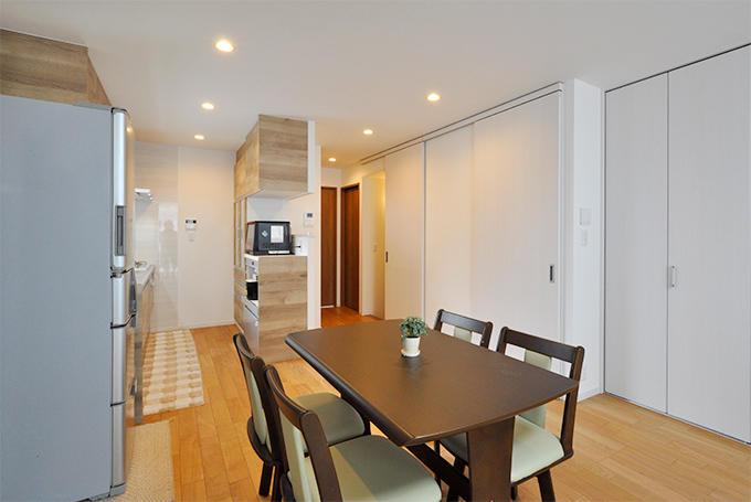 LDKと廊下の堺壁は撤去し、段差も解消しワンルームに。広くなっても冷暖房がしっかりと効くように、階段前には引き戸を取付け。床暖房も敷設したので、冬でも足元から暖かく寛げます。