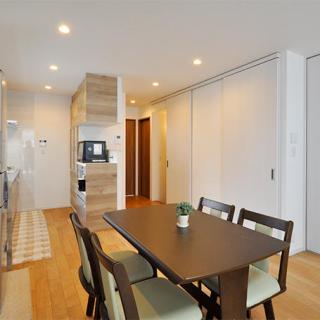 二階はダイニング・キッチン、和室、廊下の仕切り壁を取り除き、それぞれの部屋の境目にあった段差を解消。広さ35帖あるワンルームのLDKに。階段前には、天井までの高さで引き戸を取付け、冷暖房効率が良くなる工夫を。床暖房も今回のリフォームで敷設しています。