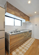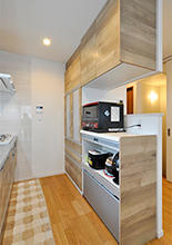 キッチン(W=2550)と背面収納(W=1800)は同じクリナップ/ラクエラで統一。扉色を木目(ライトオーク)にしてナチュラルな印象に。背面収納の裏手にできたスペースには、物入れを造作し、ストック品等が収納できるようになっています。