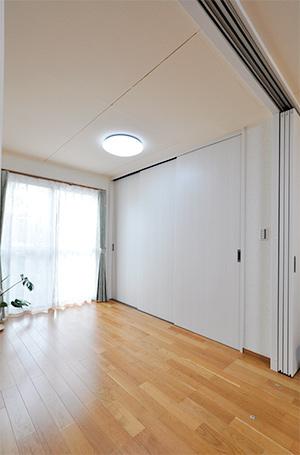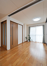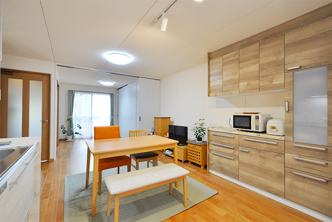 リビングダイニングは娘様のご家族が遊びに来られてもゆったりと過ごせるよう、また将来同居することも見越して、隣接する洋室を取り込み広い空間に。主寝室との境は3枚引きの吊り戸で仕切ったので、段差がなくなり、つまずく心配は解消。吊り戸は開けておけばワンルームのように広々使え、閉めれば来客時もプライベートをサッと目隠しでき便利です。