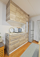 使い慣れた位置はそのままでシステムキッチン(クリナップ/ラクエラ、W=2400)に取替え。親水性コーティングを施した美・サイレントシンクやとってもクリンフードを導入し、お手入れも楽になっています。背面収納は、取り出しやすい目線の高さに食器が収納できるトール収納(クリナップ/ステディア)と、家電を並べられるカウンター+吊り戸(クリナップ/ラクエラ)の組み合わせ。シリーズ違いですが同色の木目調で揃えているので統一感があります。