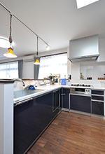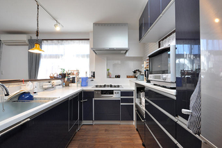 キッチンは流し台・作業スペース・コンロ・収納とU字型に配しているので、移動が少なく効率的にお料理ができます。鏡面仕上げのパネルで高級感のあるシステムキッチン&収納はトクラス/ベリー(W=1800×2400)を採用。