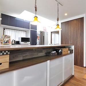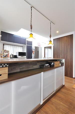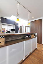 キッチンカウンターの奥行きを利用して、カウンター下に造作収納を。上段はダイニング等でよく使う物を置くオープン収納、下段は扉をつけて隠せる収納にしています。