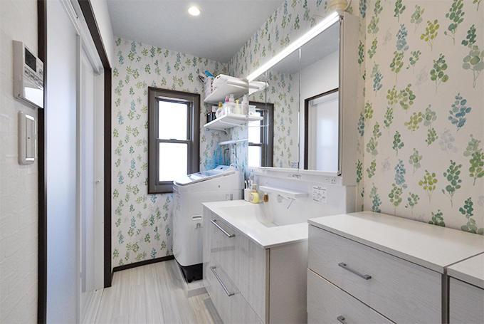 広さは以前と変わりませんが、洗濯機の場所を移すことで収納スペースを確保。洗面化粧台は横幅があり、ゆったりと使えるTOTO/オクターブ(W=1000)。洗濯機上部には棚を取り付け、洗濯洗剤や室内干し用のハンガー置き場に。
