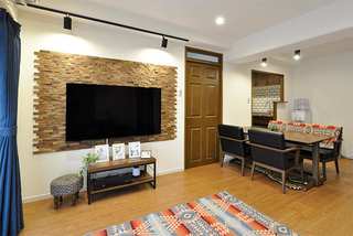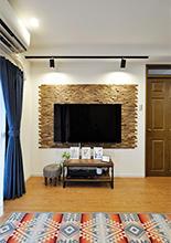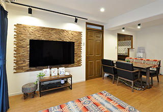 壁掛けテレビの背面は、凸凹のあるブラックウォールナットのウッドパネル(東亜通商3Dウォール)を取付け、リビングのアクセントに。上部にはスポットライトを設置しているので、部屋全体が暗くなると陰影がより強調され、また違った雰囲気を楽しめます。