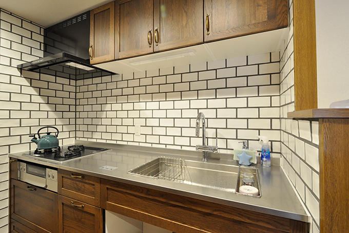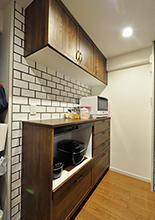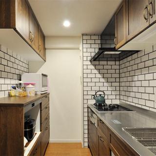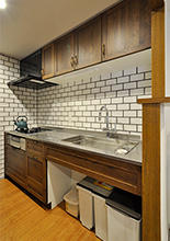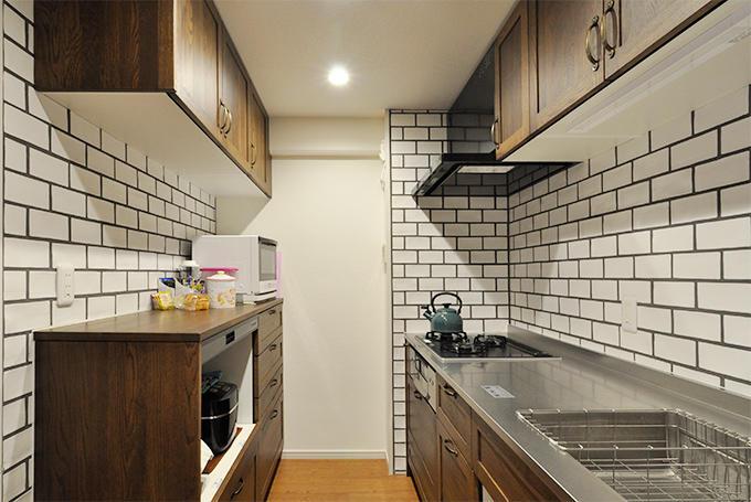 システムキッチンはK様こだわりの天然木が美しいWOODONE/スイージー(W=2250、オーク扉)。背面収納も同じWOODONE。壁はやや太めの黒目地とホワイトのサブウェイタイルの組み合わせで、カフェ風に仕上げています。