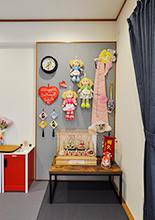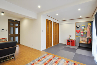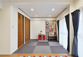 クローゼットを拡張した分、4.5帖と空間は狭くなりましたが、お子様のプレイルームとしては十分な広さ。ブルーバイオレットの縁無し半畳(セキスイ美草)なので洋室との相性もバッチリです。壁面のグレーに塗装した有孔ボードは、既設の織部床を再利用。フックを取付ければディスプレイスペースに早変わり。