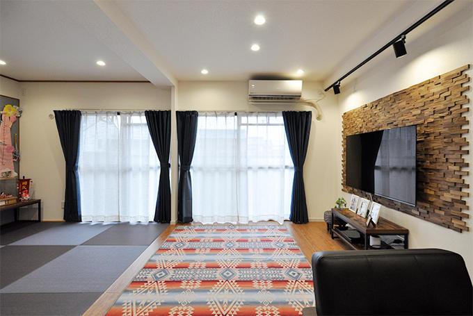 リビングに併設した6帖の和室は垂れ壁や襖を撤去し、リビングダイニングと一体化させ畳コーナーに。