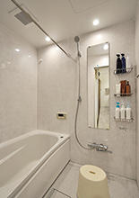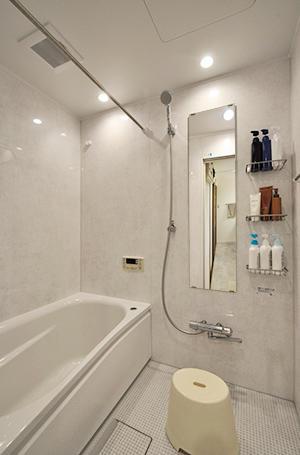 浴室はTOTO/マンションリモデルWGシリーズNタイプ(1216サイズ)。あえてカウンター無し、縦長ミラーとワイヤーシェルフのみの取付けで、スッキリとスタイリッシュに。