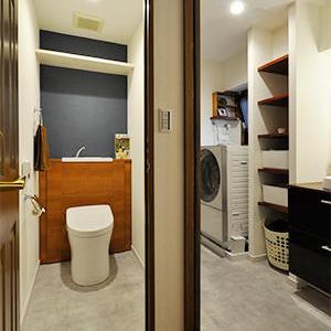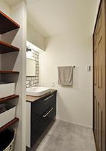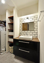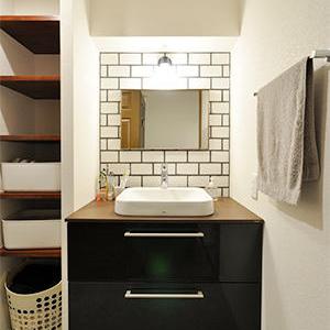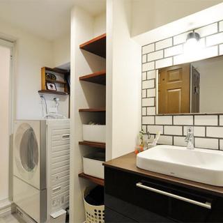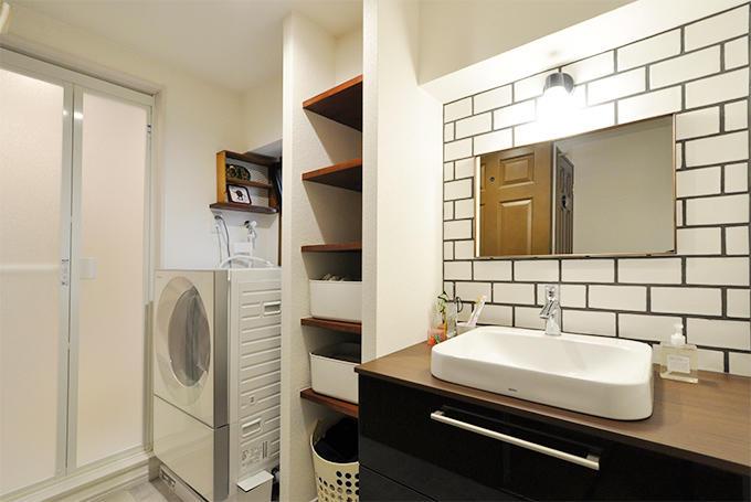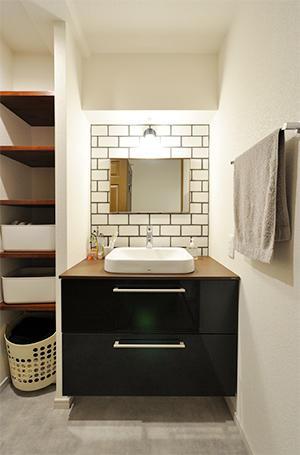 造作のようなオリジナリティーもありながら、清掃性や収納力に富んだ洗面はTOTO/ドレーナ(W=900)。キッチンと同じ黒目地×サブウェイタイルの壁に、ブラックのブラケットライト、引き出し扉のダークグリーンと、メンズライクなテイストに仕上げています。洗濯機との間にはオープンシェルフを造作。