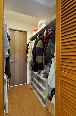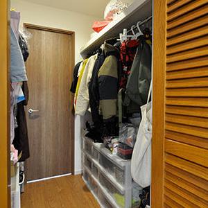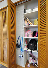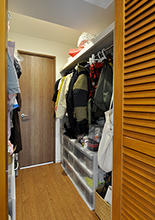 収納不足を解消するため、あえて6帖の和室を4.5帖と狭くし、収納スペースを拡張。畳コーナーから見て左側は主寝室とつながるウォークスルークローゼット、右側は日用品を入れる収納。クローゼット内部には有孔ボードを設置しているので、フックを取付ければバックやアクセサリーのハンギングが可能に。リゾートライクな雰囲気の天然木のルーバー建具(WOODONE/ピノアース)は湿気がこもりにくいデザインです。