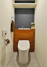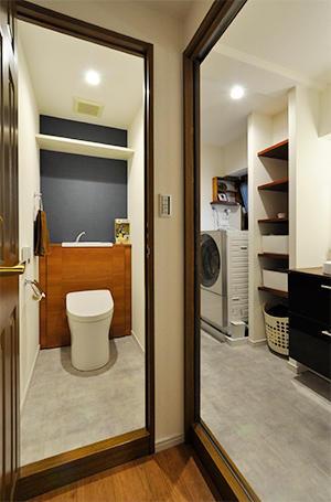 トイレは限られた空間を有効活用でき、トイレットペーパーなども収納できるTOTO/レストパルI型に交換。背面はブルーグレーのアクセントクロスで上質な雰囲気に。