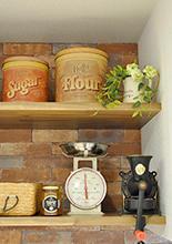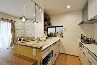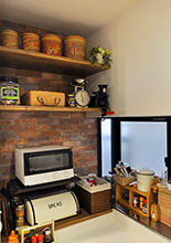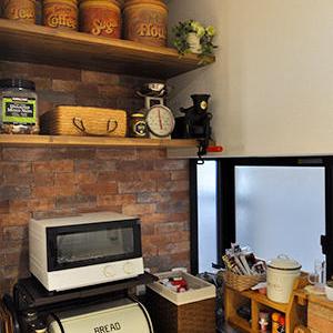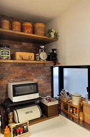 リビングとキッチンの間にある筋交いの入った壁を利用して、カウンターを取付け。下段はトースターなどの家電置き場として、上段はお気に入りの雑貨を飾るスペースとして活用しています。