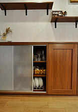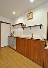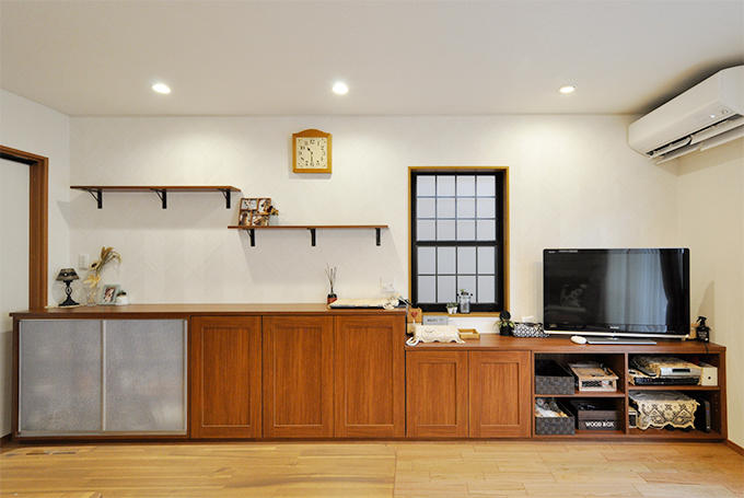 置き家具が並べられていた壁面には、カウンター収納を造作。キッチンとデザインを合わせた框組の扉と、アクリルの引き違い戸がポイント。自由にディスプレーが楽しめるよう、飾り棚も取付けています。