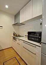 キッチンは壁付型から、シンクとコンロを分けて平行に配置したⅡ型キッチン(TOTO/ザ・クラッソⅡ型、W=1950)に。省スペースで設置できる上、体を反転させるだけで調理ができ便利です。シンク下はオープンにしてゴミ箱が置ける空間を確保。作業しやすい通路幅を確保するため、コンロ側のカウンターのみ奥行きを5cm縮めています。