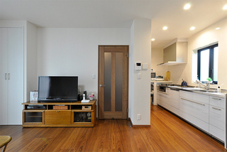 リビングには扉付きの収納を造作。内部は可動棚なので、入れるものに合わせて自由に調整ができます。室内でワンちゃんを飼っているので、床は滑りにくくキズに強いフローリング(イクタ/プリオス介護とペット)を採用。床暖房も敷設し、冬場の寒さ対策も万全です。