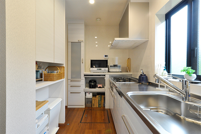 ダイニングとの間の壁は撤去することで、明るく開放感がアップ。キッチンは耐久性に優れたステンレス製のクリナップ/ステディア(W=2700)。キッチン背面の収納は、通路幅を広くするため既製品ではなくオリジナルを造作。キッチン家電はコーナー用ハイフロアカウンターに配して、L字型キッチンのように使い勝手よく。
