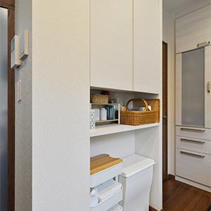 キッチンの背面収納は、通路幅を広げるため、パイプスペースの壁を一度解体し、最小限の大きさで囲い直し。キッチン本体や家電収納の扉と近い、白の横木目のメラミン化粧板で棚板と扉を造作。ゴミ箱のスペースは、リビングから見えない位置なのでお部屋がスッキリします。