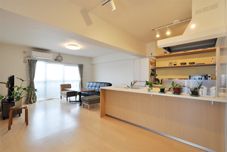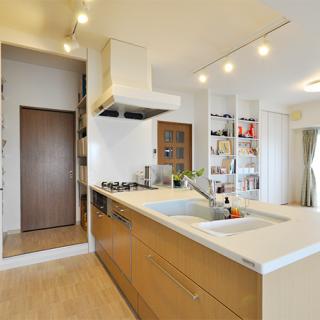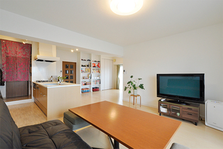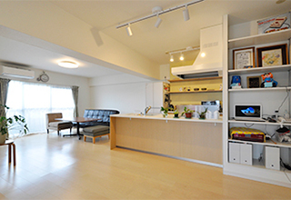 お子様の学区が変わらないエリアに中古マンションを購入されたS様。キッチンを対面式に変え、リビングダイニングを広くしたい。加えて3人のお子様それぞれに個室を設けてあげたいとリフォームをされました。LDKは日当たりの良い南側の和室を取り込んで、明るくて開放的に。リビングには押入れとオープンシェルフを造作して、収納不足を解消。思い出の写真やお子様の作品も飾れるようになり、LDKは家族がゆったりとくつろげる空間に生まれ変わりました。
