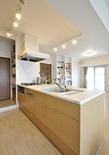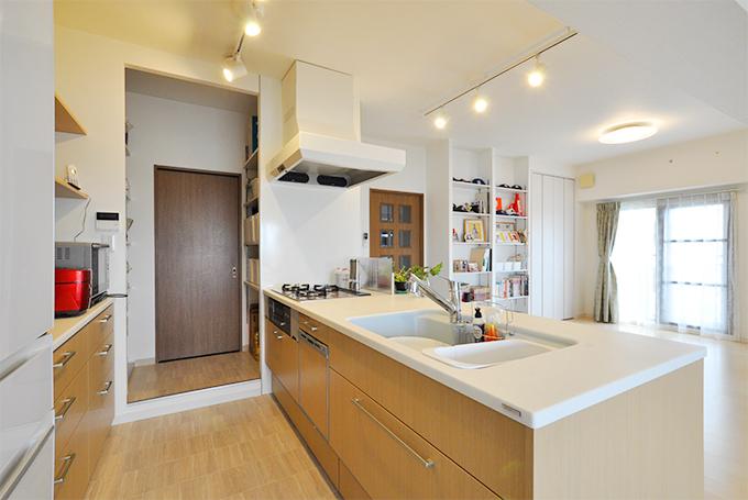 壁付だったキッチンは、フラット対面型のキッチン(トクラス/Bb)に取り替え。ダイニング側に座って食事もでき、忙しい朝などに重宝します。吊戸や腰壁がないので、リビングダイニングとの一体感もあります。