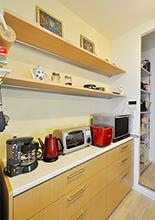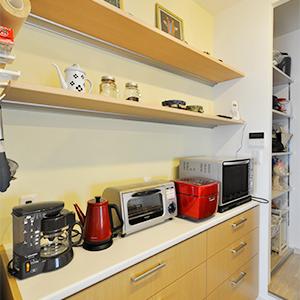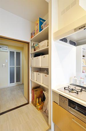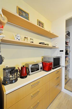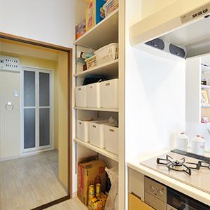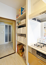キッチン背面の収納は同じメーカーで揃えて統一感を。キッチン横にはパントリーを確保。ストック品やゴミ箱を置いても余裕の収納量。パントリーを抜けると洗面室につながっており、移動が少なく家事もラクラク!