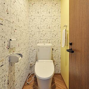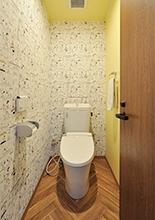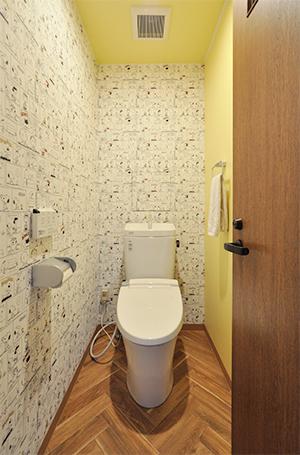 トイレは清掃性に優れた節水タイプのLIXIL/アメージュに取替え。内装はヘリンボーン柄のクッションフロアに、スヌーピー柄とイエローの壁紙でコーディネート。温かみがあり、気分も明るくなる空間に。