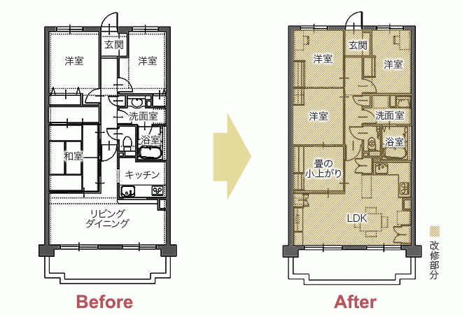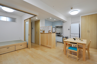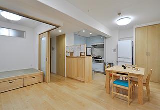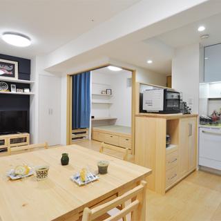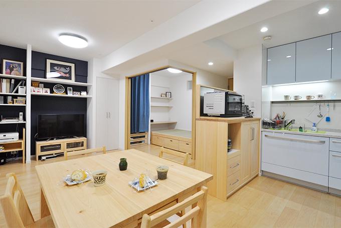 ダイニングとキッチンを隔てていた壁を取り除き、ワンルームとなったLDKは、隣接する和室スペースも取り込み、広々と解放的な空間に。子ども部屋も北側の洋室と和室(押入れ含む)をつなげて大きな空間へ。カーテンで仕切れば個室へと早変わり。各部屋、収納もしっかりと確保しています。