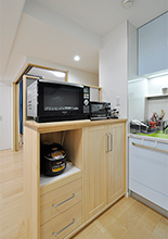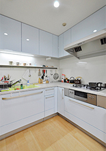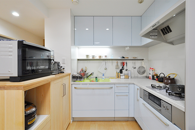 リビングダイニングとの境にあった壁は取り除き、一体感のある壁付タイプのL型キッチン(トクラス/Berry、W=1950×1800)に。シンクの位置を移動しましたが、配管空間のあるキッチン部材を使うことで、ダイニングとの段差はなくフラットに。吊り戸収納は一部昇降式になっています。