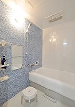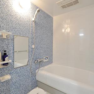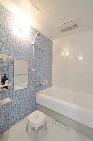 浴室は間取りやサイズはそのままで、新しいユニットバス(トクラス/VITAR、1317サイズ)に取り替え。グラスタイルのアクセントパネルで爽やかな印象に。