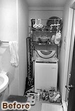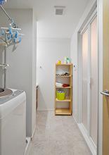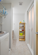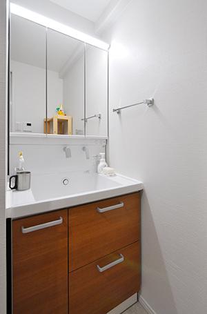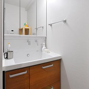 洗面室は洗濯機置き場と洗面化粧台の位置を変更。洗面化粧台はコンパクトながら、ゆったり広々使えるボウルと収納力が魅力のTOTO/サクア(W=750)に。広い着替えスペースが確保できます。