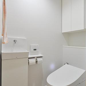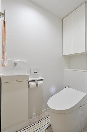 トイレはタンクレスですっきりとしたTOTO/ネオレストに。新たに手洗いと吊り戸収納を設置しています。