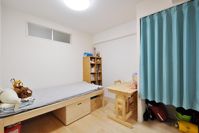 和室だったスペースを取り込んで、2部屋の子ども部屋に。間にあるカーテンを開ければ、ひとつながりの大きな空間にも早変わり。