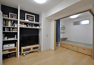 リビングの壁面は可動式のオープン棚。背面は紺色のクロスでアクセント。隣の畳小上がりとはL字のコーナー建具で仕切ることもできます。普段は開け放して解放感のあるリビングに。