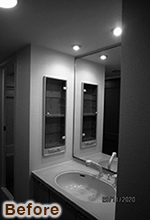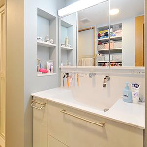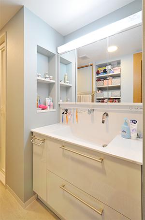 洗面化粧台は収納力のあるTOTO/オクターブ(W=1000)に取り替え。壁面についていた収納は撤去し、取り出しやすいニッチに変更。壁紙は全面ブルーグレーにして爽やかなイメージに。