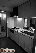 シンク横の壁や吊戸棚を取り払い、セミクローズドキッチンからオープンキッチンへとリフォーム。石目調のパネルカラーでクールな印象のシステムキッチンはクリナップ/ステディア(W=2400)。水栓は便利に使えるセンサー式に。