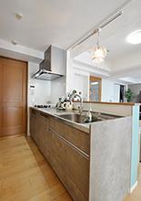 キッチンの袖壁や吊戸棚をなくし、和室との壁を撤去することでリビング・ダイニング・キッチンと一体感がアップ。お料理をしながら家族の様子がわかるようになりました。