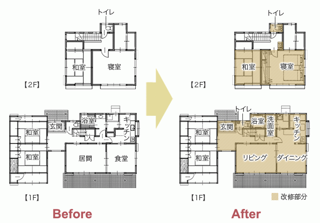 | リフォーム箇所 | 1F(キッチン、ダイニング、リビング、洗面室、トイレ、浴室、玄関、ホール、廊下、階段)、2F(トイレ、和室、寝室) |